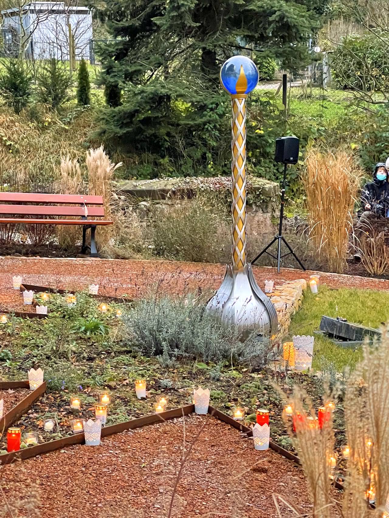 Das Besondere: In Zusammenarbeit mit der oben genannten Arbeitsgruppe und einem ersten Entwurf von Hans-Jörg Haas hat der Weisweiler Künstler Bernd Karcher für den Mittelpunkt eine Stele geschaffen. Christina Gedemer erklärt die Symbolik hierzu folgendermaßen: „Die Stele ist aus Edelstahl gefertigt und weist die Form einer sich öffnenden Blume auf. Der Edelstahl als kaltes Material weist auf den Tod des Kindes hin, so wie dieser vielfach von Angehörigen empfunden wird: Kalt und hart. Im Innern des Blumenstiels hat der Künstler goldene Farbe verwendet, diese soll die Liebe der Eltern für ihr Kind symbolisieren: Diese Liebe hält über den Tod hinaus und ist kostbar und rein wie pures Gold. Das Bild der Blume zeigt dabei auf, dass etwas Anderes, Neues gewachsen ist – eine Verbindung zwischen Erde und Himmel. Es ist etwas aufgeblüht, anders als erwartet und erhofft. Dafür steht die blaue Glaskugel aus der Glasbläserei Wolfach, die in der Blüte angebracht ist. Sie weist darauf hin, dass Eltern ihr verstorbenes Kind immer im Herzen tragen und sich immer an ihr Kind erinnern werden. Komplettiert wird dieses Sternenkinderfeld durch Bänke, um hier diese besondere Atmosphäre aufnehmen zu können, inne zu halten und zu verweilen.
