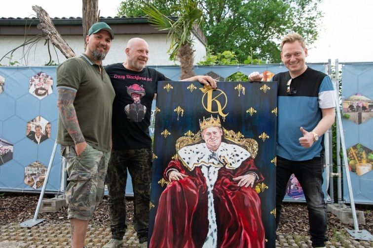 “Knossi“ darf nun ein königliches Portrait mit echtem Blattgold sein Eigen nennen. Einen Platz für das Kunstwerk muss laut „Knossi“ in seinem Haus noch gefunden werden. Wir können gespannt sein, was wir von „König Knossi“ noch alles sehen werden, denn der sympathische Künstler wird in Zukunft in einer einmaligen Live-Stream-Aktion zusammen mit Größen wie Jürgen Drews und dem Wendler auftreten.