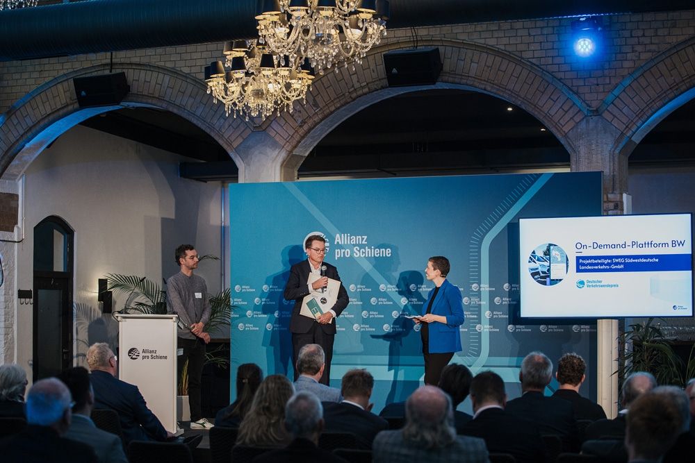 Die On-Demand-Plattform bwrider ist am Montag, 4. November 2024, in Berlin von der Allianz pro Schiene mit dem Deutschen Verkehrswendepreis ausgezeichnet worden. Die Plattform ist damit eines von bundesweit vier Projekten, die der gemeinnützige Verkehrsverband als vorbildliche und nachahmenswerte Beispiele für die Verkehrswende sieht.