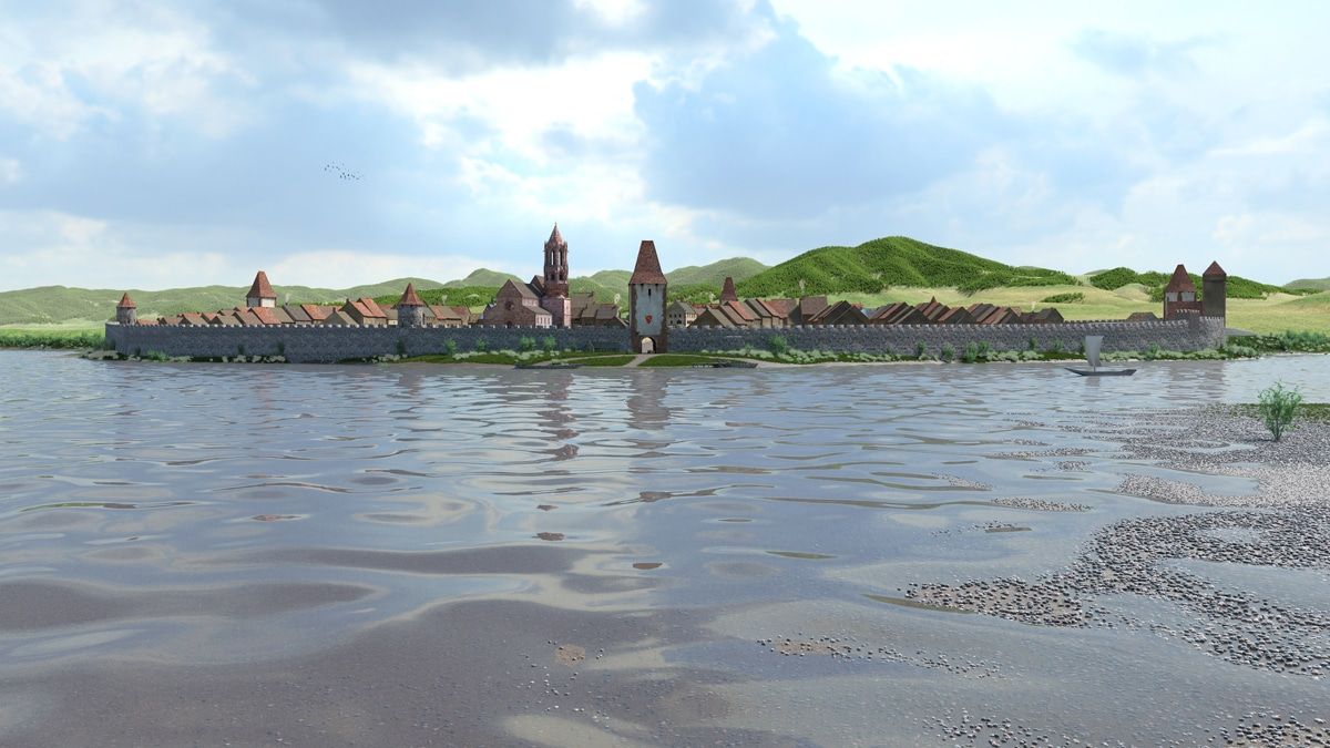 Westansicht der mittelalterlichen Stadt Neuenburg am Rhein, Rekonstruktion von Hans-Jürgen van Akkeren