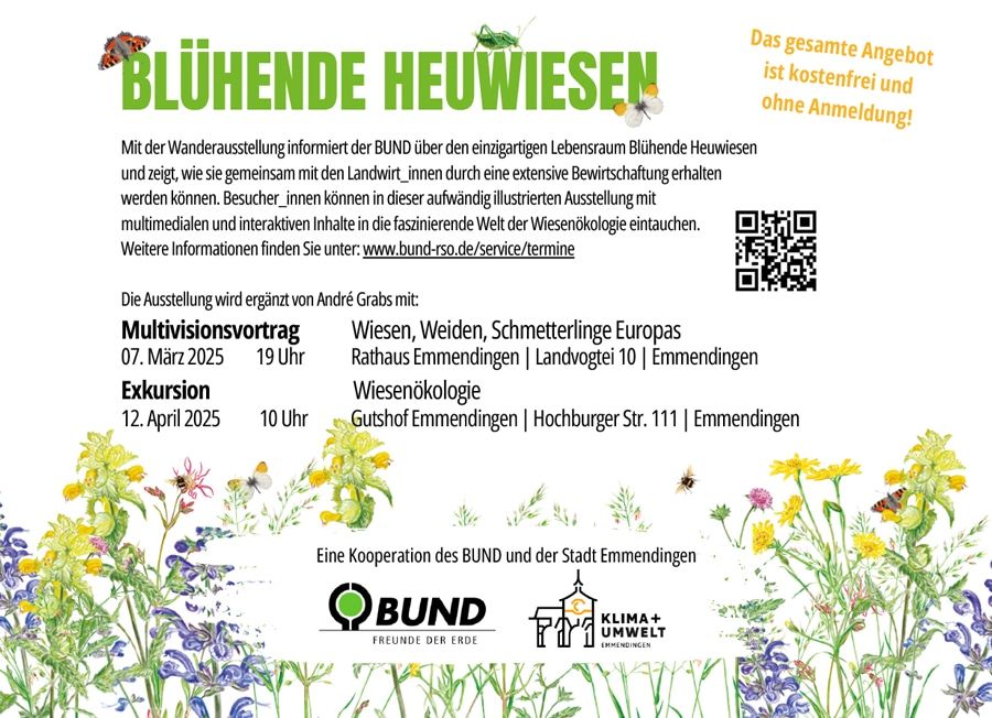 Mit einer Wanderausstellung informiert der BUND ab Dienstag, 4. März, über die faszinierende Welt der Wiesenökologie. Die Ausstellung ist aufwändig illustriert und kann bis Dienstag, 15. April, zu den Öffnungszeiten des Rathauses kostenfrei und ohne Anmeldung besucht werden.