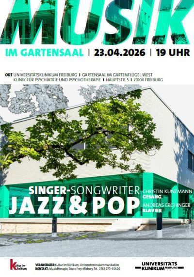 Christin Kunzmann und Andreas Erchinger präsentieren ein Duo-Programm mit eigenen Liedern zwischen Singer-Songwriter, Pop und Jazz. Das Konzert findet im Gartensaal der Klinik für Psychiatrie und Psychotherapie, Gartenflügel West, Hauptstraße 5 in Freiburg statt. Der Eintritt ist frei, eine Anmeldung ist nicht erforderlich.