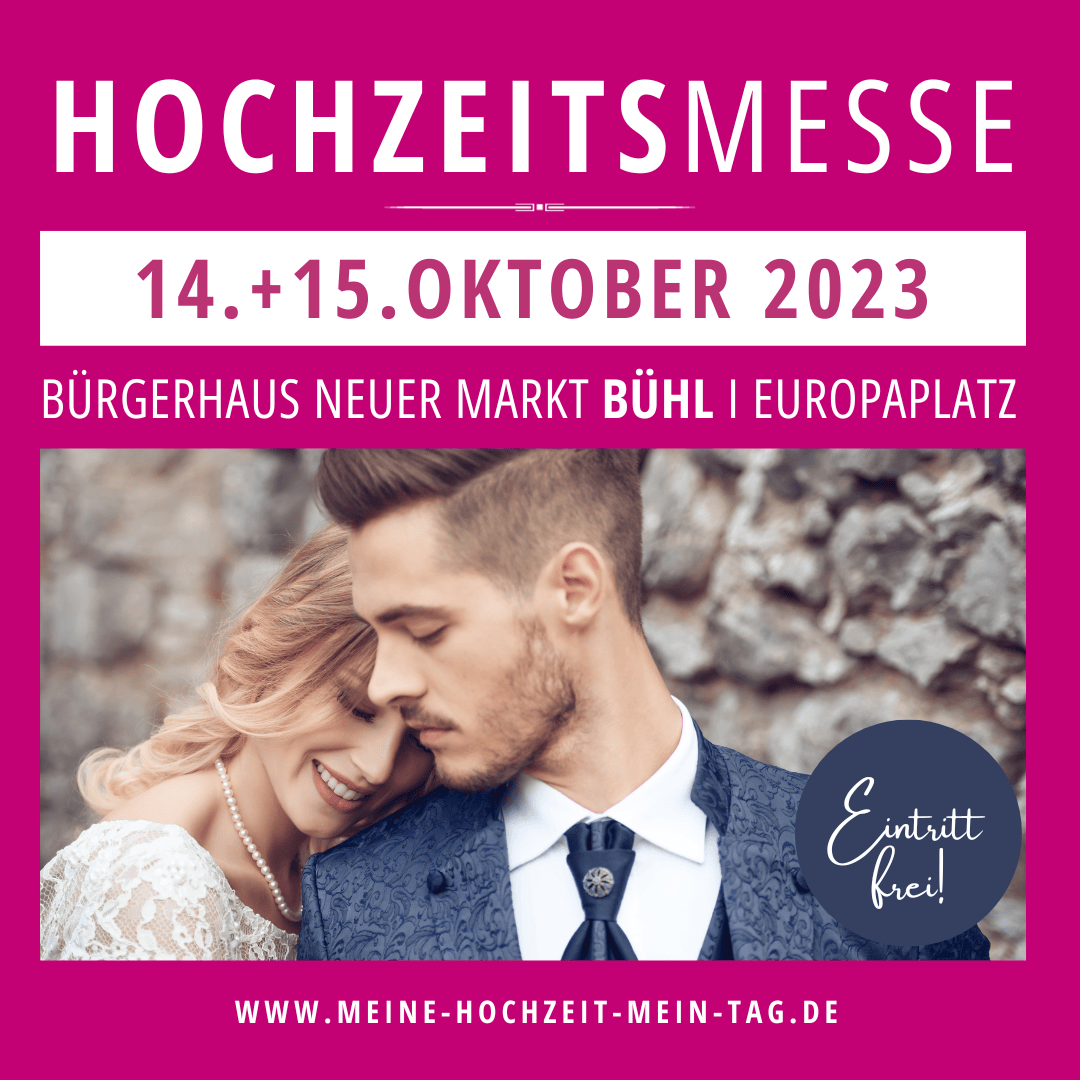 Wir laden Sie herzlich ein, die Hochzeitsmesse Bühl am 14. + 15. Oktober 2023 im Bürgerhaus Neuer Markt Bühl zu besuchen. Tauchen Sie ein in die Welt der Hochzeitsplanung und lassen Sie sich von den zahlreichen Ausstellern und Programmpunkten inspirieren. Wir freuen uns darauf, Sie an diesem magischen Wochenende begrüßen zu dürfen. Der Eintritt ist frei.