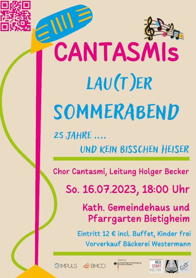 Am Sonntag, den 16. Juli um 18 Uhr Chor lädt der Bietigheimer Chor Cantasmi unter dem Motto „25 Jahre und kein bisschen heiser“ zum Sommerkonzert ins Katholische Gemeindehaus Bietigheim mit anschließendem Sommerfest mit Buffet im Pfarrgarten ein. Nach der erfolgreichen ersten Ausgabe der „lau(t)en Sommernacht“ 2022 feiert der Chor in diesem Jahr mit dem Sommerkonzert sein 25-jähriges Bestehen. Der Eintritt zum Sommerkonzert beträgt 12 Euro inklusive Buffet, Tickets sind in der Bäckerei Westermann in Bietigheim und bei allen Chormitgliedern im Vorverkauf sowie an der Abendkasse erhältlich.