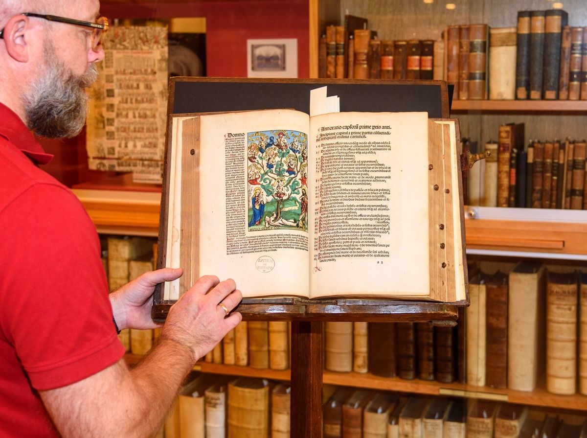 Der Leiter der Historischen Bibliothek Rastatt, Dr. Uli Steiger, vor einer Inkunabel mit aufwändiger Buchmalerei.