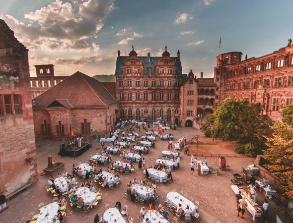 Der Schlosshof des Heidelberger Schlosses ist als Bühne und Kulisse für sommerliche Erlebnisse kaum zu übertreffen. Inmitten der beeindruckenden historischen Fassade, an weiß gedeckten Tischen, auf uralten Pfl…