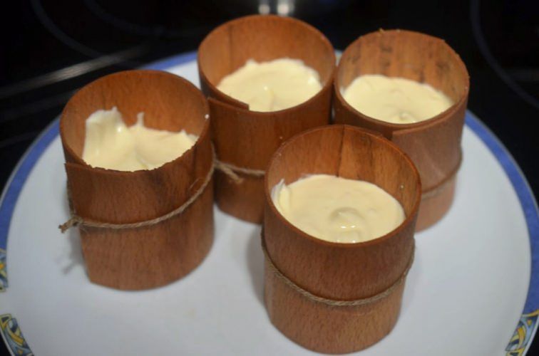Alles zusammen zu einer glatten Masse verrühren und in die Holzwraps auf den schon vorher eingebrachten Boden füllen. Dabei mindesten 3cm unter dem Rand bleiben weil die Masse bei backen aufgeht.