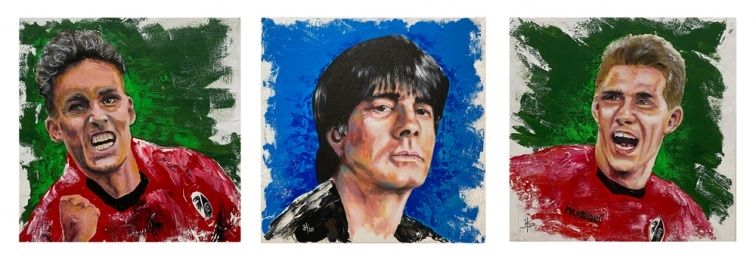 Jörg Heitz: Wenn ich neue Projekte anfange zeichne ich teils Skizzen. Vieles entsteht während eines Projektes… bei manchen Arbeiten kenne ich das Ende erstmal nicht… diese ergeben sich beim Arbeitsprozess… Es ist für mich schon eher Arbeit (Die ich gerne mache!) Wenn ich mir in den Kopf setze, male jetzt den SC Freiburg Spielerkader, dann ist es Arbeit und es ist auch natürlich mühsam 11 Motive zu malen… ich male nun seit 2014 auf Leinwand und bekomme positives Feedback. So wurde ich auch Mitglied der Abstract Art Academy, gegründet 1970 in London, die von der UNESCO gefördert ist. Das Gründungsmitglied und Ehrenpräsident Prof. Thomas Stöckl (Sitz in Freiburg) hat mich stets in einer Mentoren Rolle gefördert. Auch der Freiburger Dosenkünstler Heinz Soucek hat da eine besondere Rolle mich und meine Kunst publik zu machen. Vieles läuft über Connections, die man im Laufe der Zeit geknüpft hat. Ich mache das natürlich auch für mich… gute Arbeit, die mich erfreut und ausfüllt. Es ist doch das Wichtigste, dass man an dem was man tut Spaß hat.