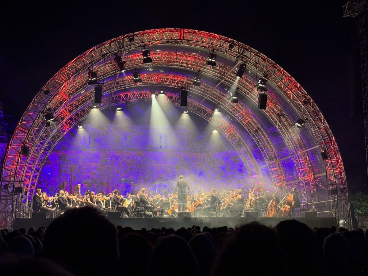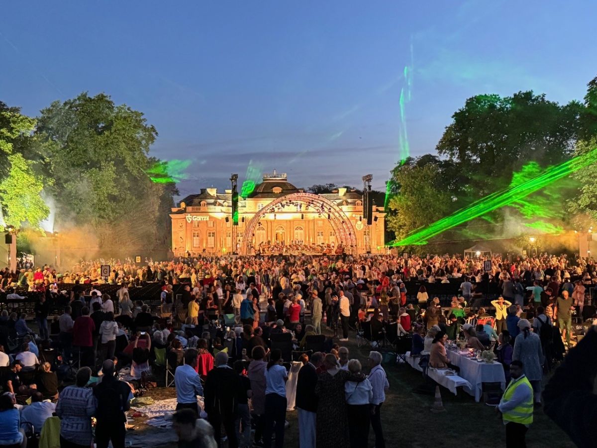 Nach der Pause widmete sich das Orchester der Suite aus Richard Strauss’ Der Rosenkavalier. Das opulente Musiktheaterwerk entfaltete in orchestraler Fassung seinen vollen Glanz und wurde in der Abenddämmerung von einer beeindruckenden Lasershow begleitet. Kombiniert mit eindrucksvollen Feuereffekten sorgte das Zusammenspiel aus Musik und Licht für den spektakulären Höhepunkt des Open-Air-Konzerts im Schlosspark. Das Publikum belohnte die Darbietung mit viel Beifall.