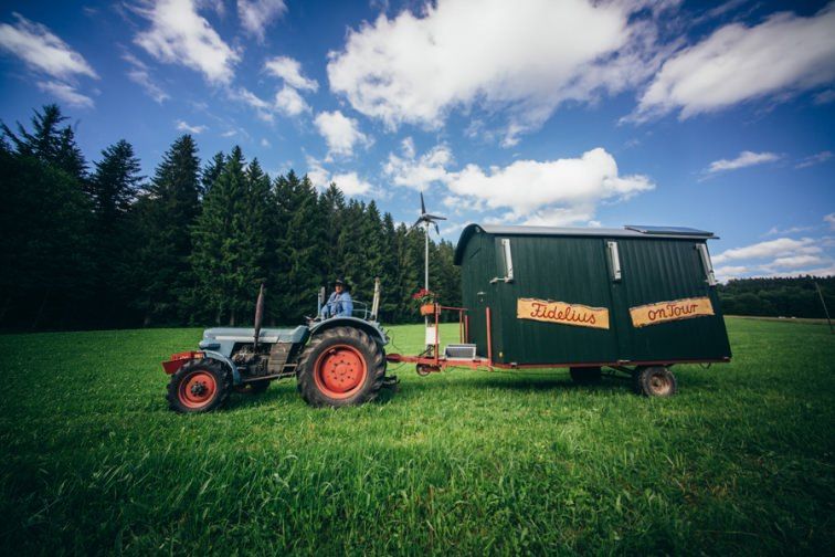 Sein „Tourbus“ ist ein alter Traktor Modell: Eicher Königstiger (Baujahr 1968) mit Spitzengeschwindigkeit 25 km/h.Daran hängt ein Forstarbeiterwagen, den der ehemalige Zimmermann zu einer Bühne umgebaut hat, der gleichzeitig sein zu Hause ist. Küche, Bad, Schlaf-, Ess- und Wohnzimmer. Abends wird eine Seitenwand aufgeklappt