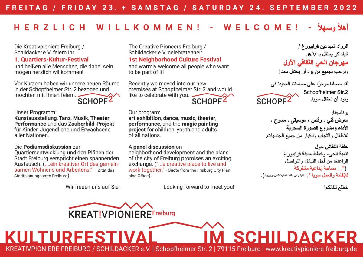 Der 2015 gegründete gemeinnützige Verein Kreativpioniere Freiburg / Schildacker e.V. richtet am Freitag, 23., und Samstag, 24. September 2022 erstmals in den neuen Räumen „Schopf 2“ an der Schopfheimer Str. 2 in Freiburg ein Kulturfestival aus. Unter dem Titel „Vor mir die Sintflut - Sustainabilty is the response“ treten zahlreiche Kunstschaffende verschiedenster Sparten in Aktion.