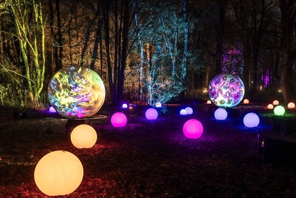 Der Christmas Garden Insel Mainauschenkt dem Publikum mit warmem Licht undschimmernden Farben Glücksgefühle und Wohlbefinden in der dunklen Jahreszeit. Die vielenneuen Highlights dieser Saison beginnen auf dem Regenbogenweg: Die Gäste flanieren aufbunten Farben, die schließlich in einen um sich selbst kreisenden Regenbogen münden. Auf der Kosmischen Reise, einer weiteren Neuheit, gibt es einen bunten Weltraum mit geheimnisvollen Planeten und farbenfrohen Leuchtkugeln zu entdecken. Wie aus anderen Sphären erscheint die neue Magische Galaxie mit kosmischen Figurenund mit einem neun Meter langen Schwarzlichttunnel aus fein gesponnenen Fäden, der durch eine eigene, mit Musik unterlegte Weltführt. Die berühmte, 162 Jahre alte Viktoria-Linde präsentiert sich den Besucher:innen alsspektakulärer Regenbogenbaum, dessen Stamm und Äste von bunten Lichtlinien durchzogensind, die synchron zu exklusiv von Burkhard Fincke komponierter Musik tanzen. Für Verblüffungsorgt als weiteres Novum derGeist der Weihnacht, wenn plötzlich einer der ehrwürdigen Bäumebuchstäblich zum Leben erwacht, und als gütiger Waldbewohner von drolligen Waldgeisternumgeben zum Publikum spricht.