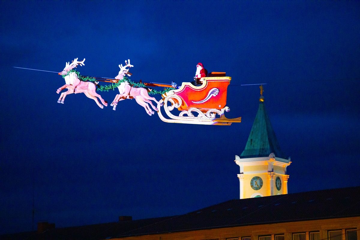 Erleben Sie täglich die beiden Shows des „Fliegenden Weihnachtsmanns“ Falko Traber mit seinem Rentierschlitten, wenn er um 17 und 19:30 Uhr über den Marktplatz fliegt und damit nicht nur Kinderaugen zum Leuchten bringt. Der „Fliegende Weihnachtsmann“ wird präsentiert vom Karlsruher Verkehrsverbund (KVV) und der Sparkasse Karlsruhe.