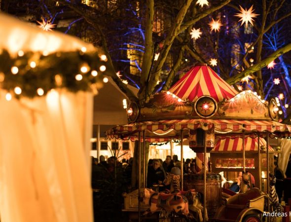 Der Sternenhimmel leuchtet wieder über dem besonderen Weihnachtsmarkt auf den Kapuzinerplanken in der Mannheimer Innenstadt.