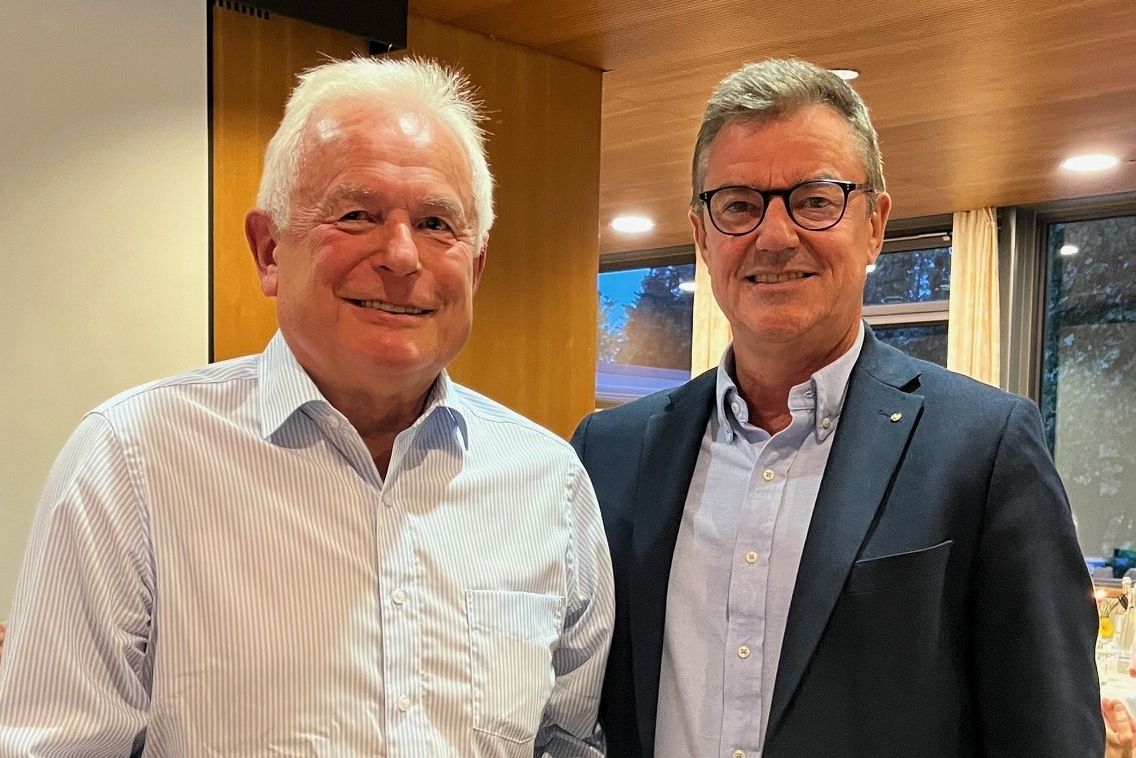 Bürgermeister Volker Kieber (rechts) würdigte das Ottmar Seywald langjährige kommunalpolitische Engagement des dienstältesten Bad Krozinger Gemeinderates Ottmar Seywald (links)