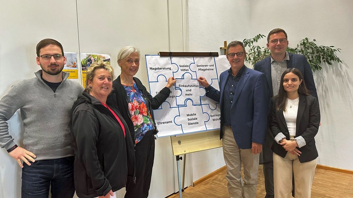 Auf den Start freuen sich: (v.l.) Pflegedienstleister Christoph Steiert, Projektleiterin Edeltraud Saier-Johannes und Geschäftsführerin Waltraud Kannen von der Sozialstation, Bürgermeister Volker Kieber sowie Jan Fischer und Chiara Toma, die das Projekt von städtischer Seite aus begleiten.