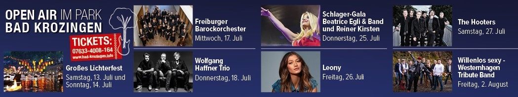 Auskünfte und Eintrittskarten für alle Open Air Veranstaltungen gibt es bei der Tourist-Information Bad Krozingen, Tel. 07633 4008-164 sowie online unter www.open-air-im-park.de