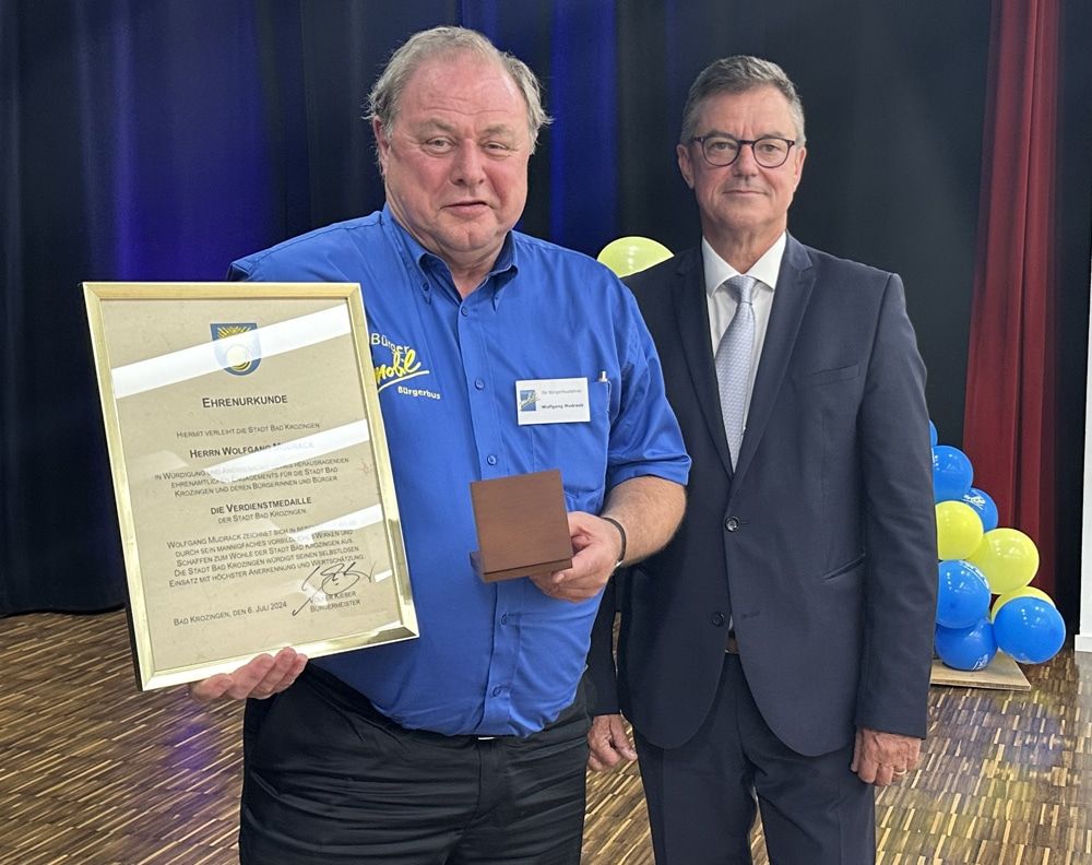 Bürgermeister Volker Kieber nutzte die Jubiläumsfeierlichkeiten, um mit Wolfgang Mudrack ein weiteres verdientes Bürgerbus-Mitglied zu ehren, das sich darüber hinaus aber auch durch seine vielfältigen ehrenamtlichen Tätigkeiten in anderen Vereinen und Institutionen der Stadt verdient gemacht hat. Auch Wolfgang Mudrack ist ein Bürgerbusmitglied der ersten Stunde und hat den Verein in den letzten 20 Jahren nicht nur als Fahrer, sondern seit 2019 auch als Vorstandsmitglied wesentlich mitgestaltet. In seiner Laudatio beschreibt Bürgermeister Volker Kieber den Geehrten als einen großen Kommunikator und Netzwerker aber auch als einen „Schaffer“, der stets nach dem Motto handele: Geht nicht, gibt’s nicht. Von diesen Eigenschaften profitieren aber nicht nur der Bürgerbus, sondern auch viele andere Vereine, Institutionen und Gruppen, für die sich Wolfgang Mudrack über viele Jahre hinweg in und für die Stadt Bad Krozingen zum großen Teil bis heute engagiert. Für diesen großartigen ehrenamtlichen Einsatz bedankte sich der Bürgermeister auch im Namen der Stadtgesellschaft. Unter anderem hat Wolfgang Mudrack 14 Jahre lang als Gemeinderat in der CDU-Fraktion aktiv die Entwicklung der Stadt Bad Krozingen mitgestaltet. Darüber hinaus war er 15 Jahre lang Vorsitzender des CDU-Stadtverbandes, dessen Ehrenvorsitzender er heute ist, sowie Stellvertretender Vorsitzender des CDU-Kreisverbandes Breisgau-Hochschwarzwald und hat in dieser Funktion sowie auch in seiner Funktion als Mitglied im Regionalverband auch überregional für die Interessen der Stadt gewirkt.