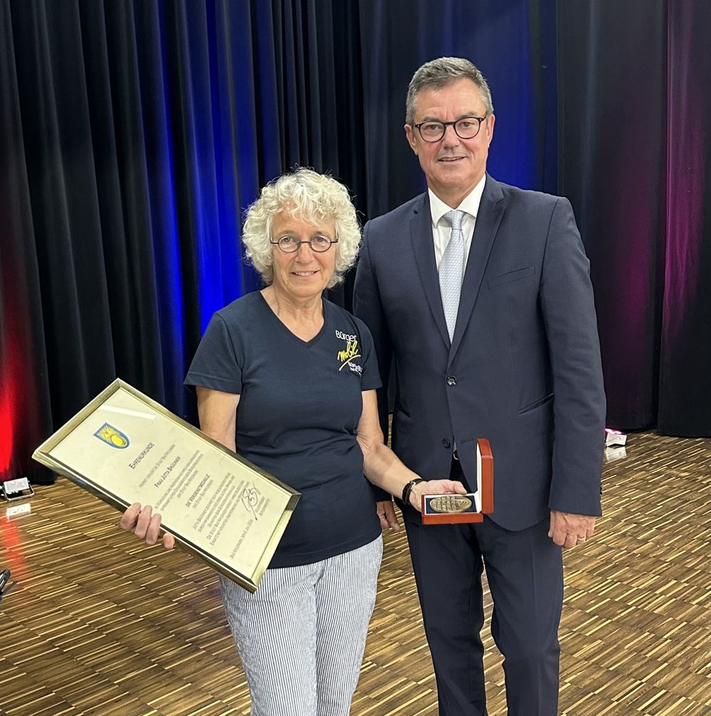 In Anerkennung ihres Einsatzes für den Bad Krozinger Bürgerbus und damit auch für die Stadt Bad Krozingen wurde die 1. Vorsitzende des Bürgerbus-Vereins, Jutta Brückner, ebenfalls mit der Stadtmedaille ausgezeichnet. Zum Bürgerbus kam Jutta Brückner 2009. Zunächst als Fahrerin, bevor Sie 2010 die Kasse von Dieter Georgi übernahm und 2019 dann schließlich in das Amt der 1. Vorsitzenden des Bürgerbus-Vereins gewählt wurde. Damals ahnte Jutta Brückner noch nicht, dass sie knapp ein Jahr später, aufgrund der Corona-Pandemie, den Bürgerbus im wahrsten Sinne des Wortes durch ein schwieriges Fahrwasser würde manövrieren müssen, so der Bürgermeister in seiner Laudatio. Die Pandemie habe auch auf den Betrieb des Bürgerbusses große Auswirkungen gehabt und damit verbunden eine große zusätzliche Verantwortung bedeutet, die Jutta Brückner jedoch, gemeinsam mit der Stadt, engagiert und souverän geschultert hätte. Gerade da habe sich auch gezeigt, wie sehr sich Jutta Brückner mit dem Verein identifiziere und ihr das Wohl derjenigen, die den Verein tragen und ausfüllen, am Herzen liegen, bedankte sich der Bürgermeister bei der Geehrten. Mit der Stadt stehe die Vorsitzende aber auch sonst stets in einem offenen, konstruktiven und wenn nötig auch kritischen Austausch, immer mit dem Ziel: Der Bürgerbus muss fahren!