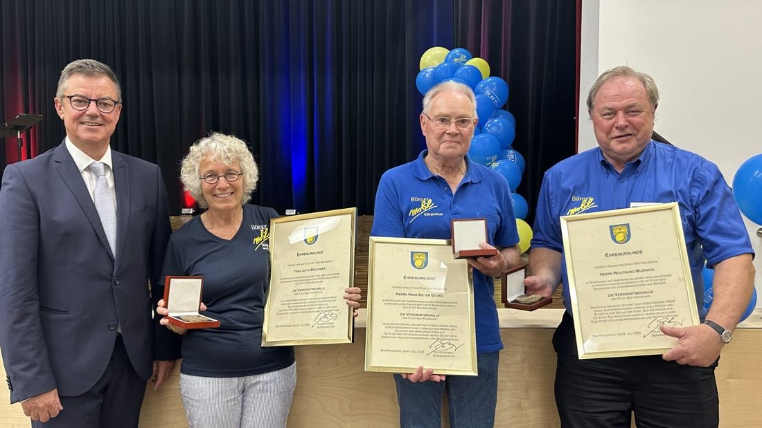 Bürgermeister Volker Kieber verlieh die Verdienstmedaille der Stadt Bad Krozingen an (v.l.) Jutta Brückner, Dieter Georgi und Wolfgang Mudrack.