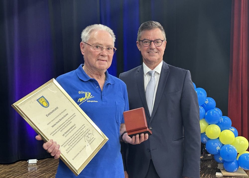 Mit der Verleihung der Verdienstmedaille der Stadt an Dieter Georgi, würdigte die Stadt das langjährige Engagement einer Bürgerbus-„Institution“. Zum Bürgerbus kam der mit seiner Frau aus dem Saarland zugezogene Dieter Georgi am 26.10.2004. Seither ist er dem Bürgerbus treu geblieben und da er sich bis heute einer besten Gesundheit erfreut, fährt er mit mittlerweile 83 Jahren noch regelmäßig seine Touren durch die Bad Krozinger Innenstadt. Mit über 600 Fahrten als Bürgerbusfahrer kann er dabei auf die höchste Anzahl an Fahrten zurückblicken, die ein Bürgerbusfahrer bisher erbracht hat. Für viele Fahrgäste ist Dieter Georgi deshalb längst schon zu einer Bürgerbus-Institution geworden. Allerdings soll jetzt Ende des Jahres Schluss sein, dann sollen mal die „Jungen“ ans Steuer, wie er selbst sagt. Dieter Georgi hat sich aber nicht nur als Bürgerbusfahrer engagiert. 2005 übernimmt er die Vereinskasse und wird damit auch Vorstandsmitglied. 2010 scheidet er aus dem Vorstand aus, kümmert sich als Kassenprüfer jedoch bis heute um die Finanzen des Vereins. Aber es ist nicht nur die Arbeitsmoral und die Freude am Fahren, die Dieter Georgi auszeichnen, wie Bürgermeister Volker Kieber in seiner Laudatio beschreibt: „Von Anfang an haben Sie sich für den Erhalt und die Weiterentwicklung des Bürgerbusses eingesetzt und es war Ihnen stets an pragmatischen Lösungen gelegen, für die Sie sich auch eingesetzt haben. Menschen wie Sie, auf die stets Verlass ist und die bei all ihren Erfolgen gerne im Hintergrund bleiben und sich darüber freuen, wenn der Verein „funktioniert“, sind das Rückgrat eines jeden Vereins. Deshalb möchten wir Sie heute auch - exemplarisch für alle diese wertvollen Menschen im Ehrenamt - mit der Verdienstmedaille der Stadt Bad Krozingen auszeichnen.“