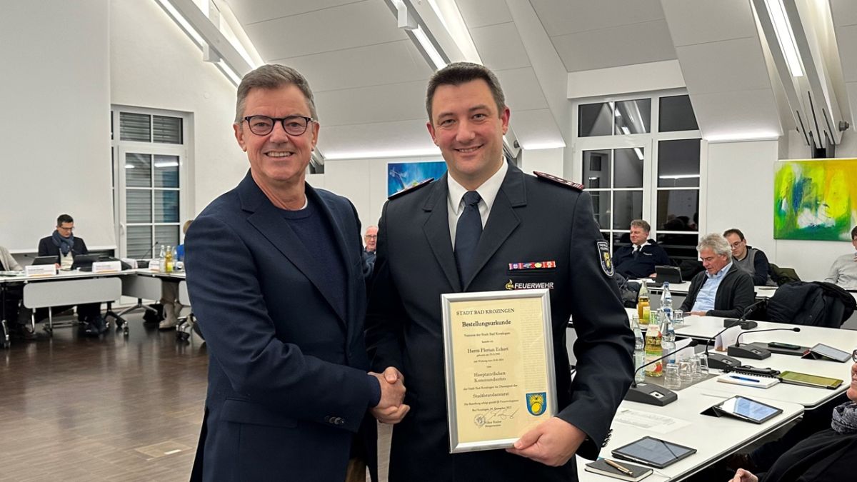 In der öffentlichen Sitzung vom 4.12.2023 hat der Gemeinderat Florian Eckert mit Wirkung zum 01.01.2024 einstimmig zum hauptamtlichen Kommandanten der Freiwilligen Feuerwehr Bad Krozingen, mit den Abteilungen Kernstadt, Biengen, Hausen, Schlatt und Tunsel, bestellt.