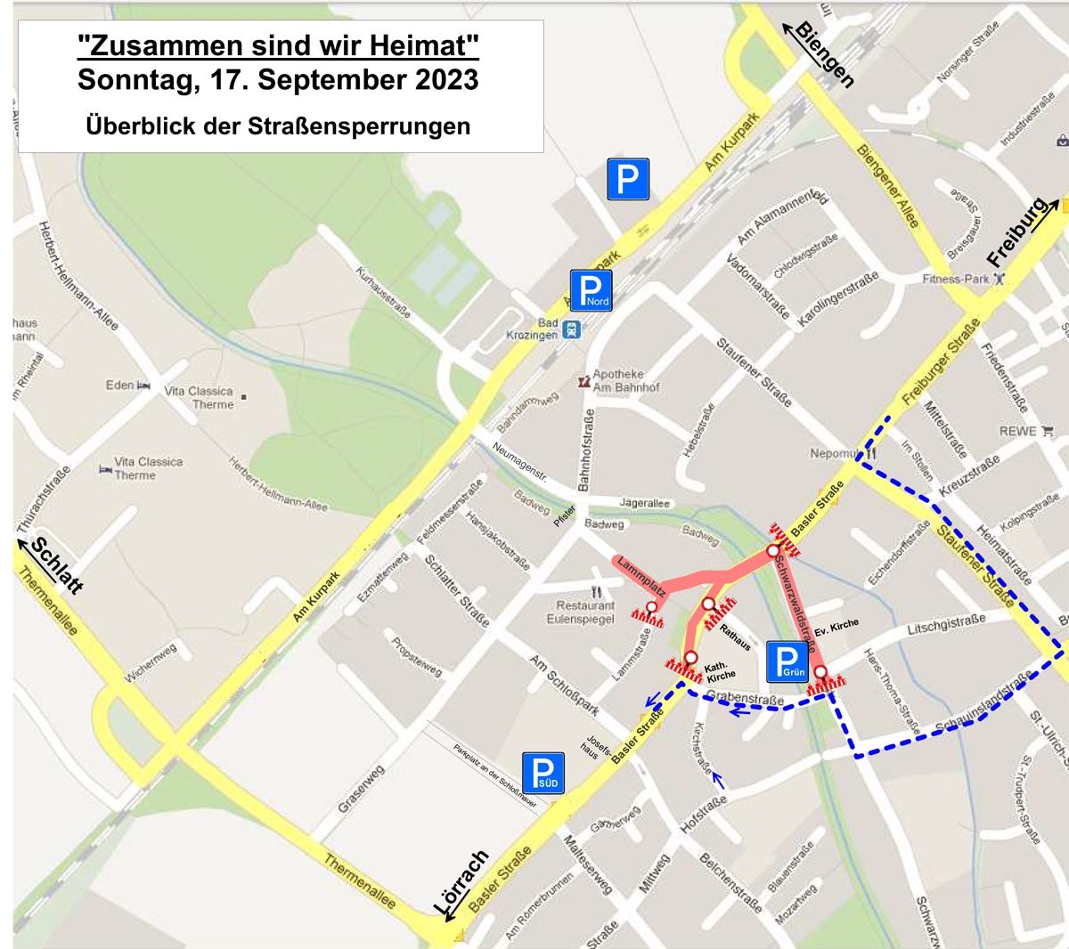 Wo gefeiert wird, werden zwangläufig Straßen für den allgemeinen Verkehr gesperrt, so auch am 17. September von circa 09.00 bis 19.00 Uhr: Basler Straße zwischen Schwarzwald- und Joseph-Vomstein-Straße/Graben – Schwarzwaldstrasse zwischen Basler und Litschgistrasse – der Lammplatz mit Lammstrasse im Bereich zwischen Basler Straße und Sparkasse. Von den Straßensperrungen sind auch der Melanchthonweg sowie die Parkflächen entlang der Schwarzwaldstrasse und auf dem Parkplatz „Im Grün“ betroffen, hier ist keine Zu- oder Abfahrt mit dem Fahrzeug während des Tages möglich.