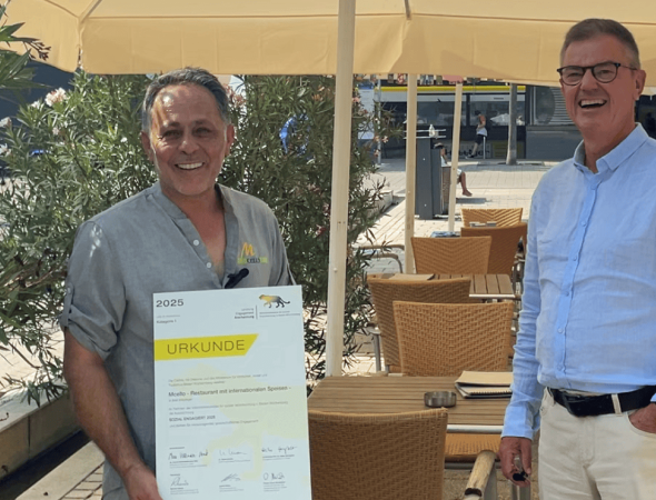 Restaurant MCello erhält Auszeichnung für soziales Engagement. Oberbürgermeister Volker Kieber gratuliert.
