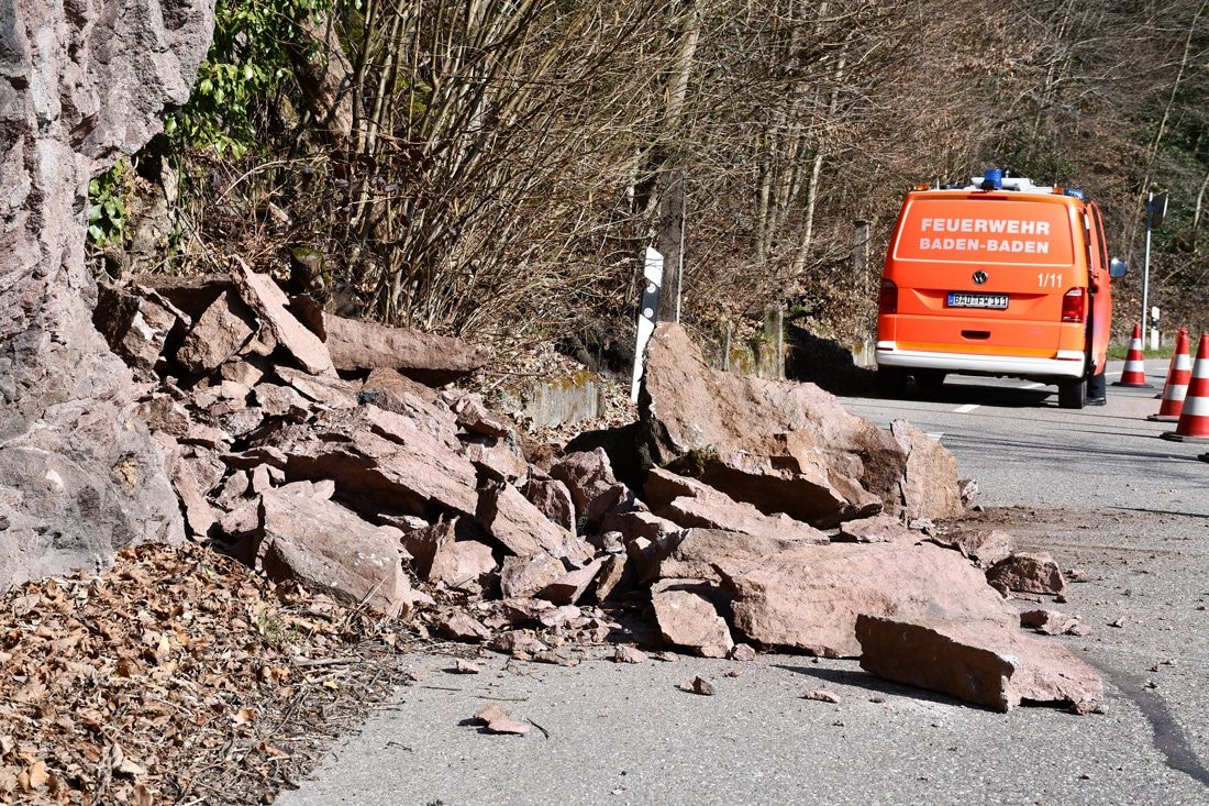 Baden-Baden. Ein Felssturz auf der Geroldsauer Straße in Baden-Baden hat am Samstagmittag (8. März) Teile der Fahrbahn blockiert