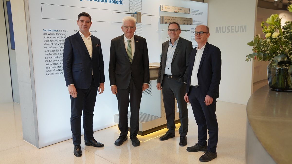 Baden-Württembergs Ministerpräsident Winfried Kretschmann zu Besuch beim Marktführer Schöck in Baden-Baden (v. l.): Mike Bucher (Vorstandsvorsitzender), Thomas Stürzl (Vorstand Kaufm. Bereich) und Dr. Harald Braasch (Vorstand Technik).