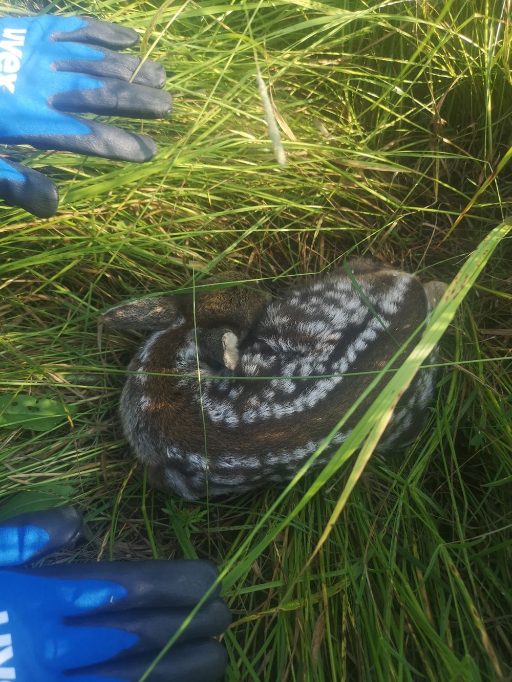 „Es ging pünktlich um 4 Uhr morgens mit dem Kitzrettungsteam und dem Landwirt am Feld los. Die Drohne wurde gestartet, um die Fläche nach einem vorab programmierten Suchraster abzufliegen. Ist eine Wärmesignatur entdeckt, machen sich die Helfer rasch auf den Weg. Zur Ausrüstung zählt neben den unverzichtbaren Handschuhen ein eigens dafür konzipierter Karton und Markierungsband. Der Drohnenpilot übermittelt per Funk die genaue Lage und Entfernung an die Helfer. Ist das Kitz im hohen Gras erspäht, geht es schnell. Der Karton wird aufgebaut, mit Grasbüscheln ausgelegt und das Kitz vorsichtig hineingelegt. Der Karton wird an eine schattige Stelle gebracht, welche nicht gemäht wird. Ein Band markiert die Stelle des Kartons, so dass der Landwirt oder Jagdpächter nach der Mahd das Kitz umgehend wieder freilassen kann. Nach der Befliegung wird die untersuchte Fläche sofort gemäht. Es wird somit verhindert, dass die Ricke ihr Kitz zwischenzeitlich wieder im hohen Gras ablegt. Je nach Größe der Wiesenfläche können so mehrere Kitze, Einzeltiere oder auch Zwillinge oder gar Drillinge vor dem Tod bewahrt werden. Ganz wichtig bei der Kitzrettung ist, immer Handschuhe zu tragen, da Kitze keinen Eigengeruch besitzen. Der fehlende Eigengeruch schützt sie vor umherziehenden Fressfeinden. Hat das Kitz aber erst einmal den menschlichen Geruch angenommen, kann dies dazu führen, dass die Ricke das Jungtier nicht mehr annimmt – also ein sicheres Todesurteil für die kleinen Tiere. So ist es folglich auch für Spaziergänger wichtig zu wissen, dass ein abgelegtes Kitz niemals angefasst werden darf. Das Muttertier kommt nach einiger Zeit zurück und nimmt das Kitz wieder mit. Sollte sich das Kitz in einer offensichtlichen Notsituation befinden, beispielsweise Blutspuren am Fell, ist der zuständige Jagdpächter zu informieren.