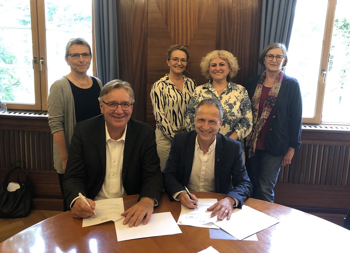 Bürgermeister Roland Kaiser und Peter Möller, geschäftsführender Vorstand der Eberhard-Schöck-Stiftung (sitzend von rechts), unterzeichnen die Fördervereinbarung. Kristin Bischoff, Projektleiterin der Schöck-Stiftung, Julia Koch, Dr. Irada Allahverdiyeva und Svetlana Bojcetic freuen sich über die Kooperation.