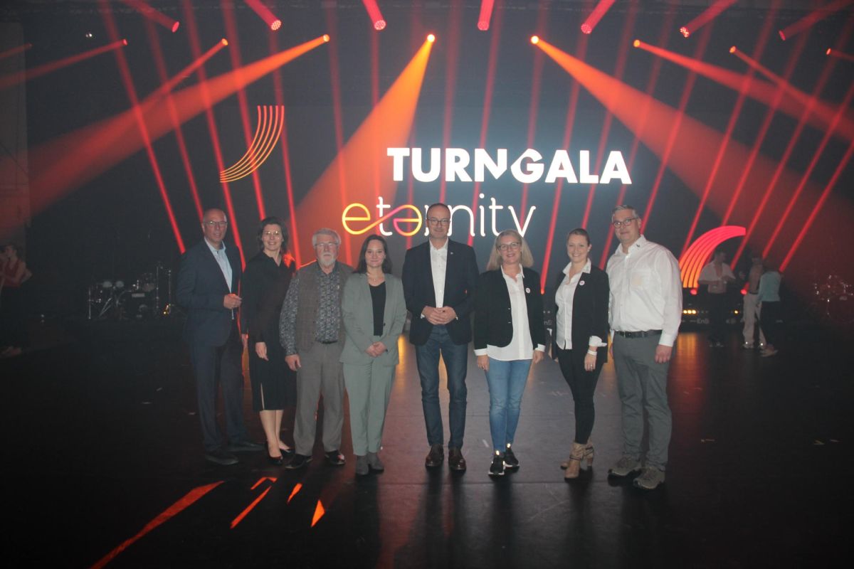 Personen: v.l.n.r.: Markus Frank (Präsident STB), Ramona Müller (Geschäftsführerin BTB), Gerhard Mengesdorf (Ehrenpräsident BTB), Kerstin Eisele (Präsidentin BTB), Uli Burchardt (Oberbürgermeister der Stadt Konstanz), Karin König-Ess (Präsidentin Thurgauer Turnverband), Melanie Nägeli (Verantwortliche Turnbetrieb Thurgauer Turnverband)