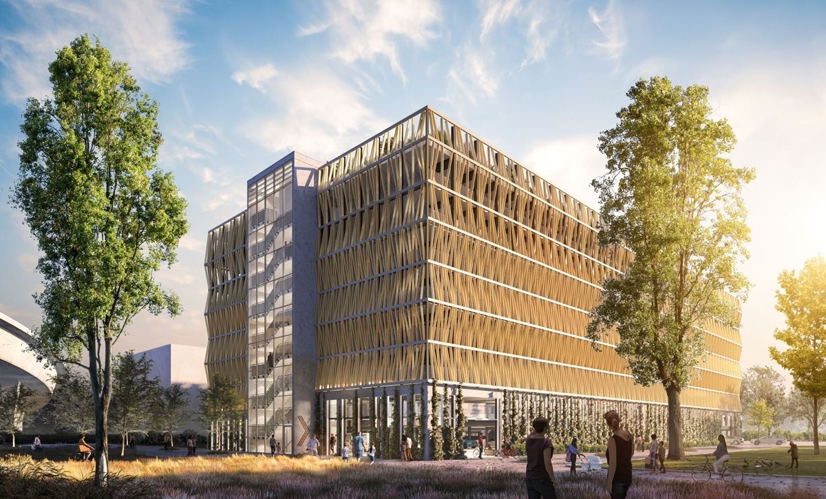 Die Fassade wird mit schrägen Lamellen versehen. Der Sockel verläuft über zwei Geschosse und wird mit Pflanzen begrünt. In den oberen Geschossen besteht die Fassade aus Alulamellen, die in verschiedenen Richtungen schräg angeordnet werden, so dass eine Dreidimensionalität entsteht. Oben verringert sich die Anzahl der Lamellen. So löst sich die Fassade nach oben hin optisch auf und gibt dem Gebäude mehr Leichtigkeit. Außerdem werden Photovoltaik-Module auf dem Dach angebracht.
