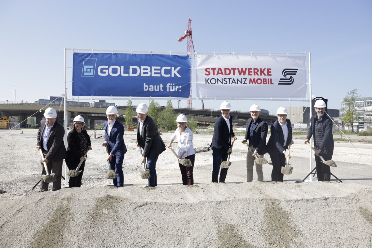 Spatenstich für das neue Parkhaus Europabrücke in Konstanz: (von links) Kai Haber (Geschäftsleitung Stadtwerke), Katja Romer (Projektleitung Stadtwerke), Dr. Norbert Reuter (Geschäftsführer Stadtwerke), Jörg Parschat (Niederlassungsleiter Firma Goldbeck Engen), Nina Welschinger (Stadtwerke Konstanz Mobil GmbH), Oberbürgermeister Uli Burchardt, Bürgermeister Karl Langensteiner-Schönborn, Andreas Müller (Verkaufsingenieur Firma Goldbeck) und Architekt Roland Haehnel.