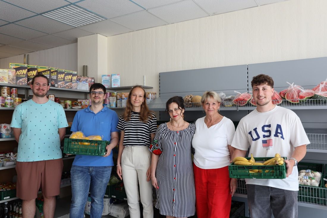 Stellvertretend für das Azubi-Team übergaben (von links nach rechts) Sandro Reinhold, Dominik Fischer Lopez, Johanna Marxer und David Bracker 1460 Euro an Marietta Bondarenko und Anita Hoffmann (vierte und fünfte von links) von der Konstanzer Tafel.