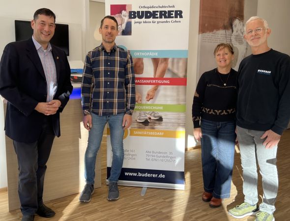 Ein „Katzensprung“ war es für Bürgermeister Markus Hollemann, als er kürzlich das Team der Firma Orthopädieschuhtechnik Buderer in den neuen Räumlichkeiten in der Hauptstraße 153 besuchte.