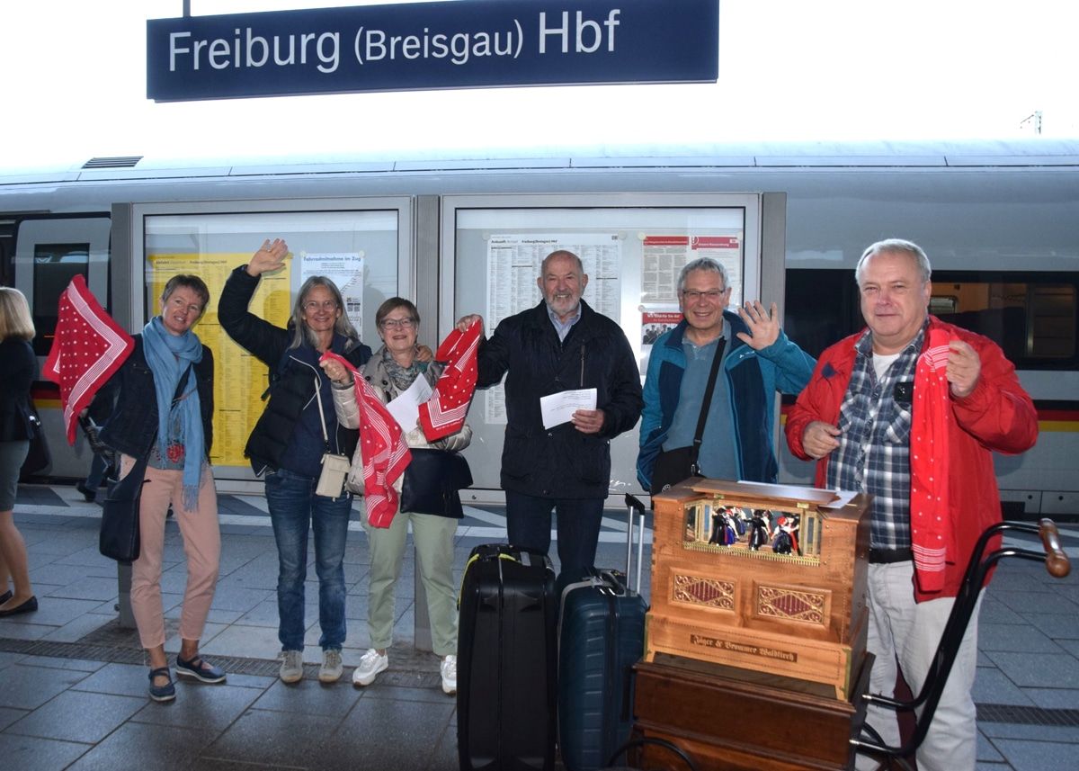 Die Überraschung ist gelungen, als Wolfgang Brommer mit seiner Drehorgel auf dem Bahnsteig langsam näherkam und die beiden „Auswanderer“ sichtlich überraschten. Wolfgang Brommer, Christine Dormanns-Reich und Sepp Reich, Carola Wehrbein als Nachfolgerin der Buchhandlung Augustiniok, die Oliver Dormanns seit den Neunziger Jahren als Inhaber führte und Hubert Bleyer als Vertreter der Waldkircher Orgelwelt zückten das Abschiedstuch, sangen mit der Drehorgel begleitet dem Ehepaar Dormanns ein Abschiedslied. Nach der Melodie „Zum Städele hinaus“ sangen sie Monica und Oliver Dormanns ein eigens, umgetextetes Lied mit der Bitte, auch wieder einmal zurückzukommen.