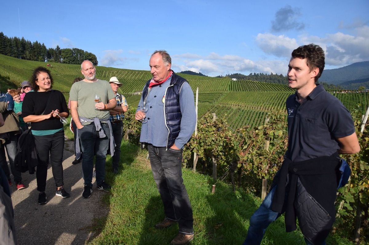 Da sehr gerne nachgefragt, kann man sich gleich zu Beginn um 13 Uhr einer fachkundigen Führung anschließen. Treffpunkt ist bei der Ortsverwaltung, nur ein paar Meter von der S-Bahnhaltestelle. Eine Anmeldung ist nicht erforderlich, doch ist ein Unkostenbeitrag von 27,-- Euro zuzüglich Pfand zu entrichten. Eingeschlossen sind neben der Führung je zwei Weinproben an den vier Stationen und Erläuterungen zum jeweiligen Betrieb. Viele wissen es bereits und genießen die Wanderung im Freundeskreis oder Gruppen in freier Natur mitten in den Rebbergen, der weit sichtbaren von der Sonne verwöhnten Sonnhalde. Die Strecke ist so abwechslungsreich, dass auf die Teilnehmer die besten Aus- und Weitblicke warten. Der Hausberg, der 1.243 m hohe Kandel mit seinem Kandelfelsen sticht hervor genauso wie der Blick auf den Schwarzwald und die Rheinebene mit der Kaiserstuhl. Diese seit 2007 stattfindende Weinwanderung war ein Mosaikstein für die Auszeichnung als empfohlener Weinort „Weinsüden Weinort“ des Tourismus-Verbandes und Tourismus Marketing Baden-Württemberg.