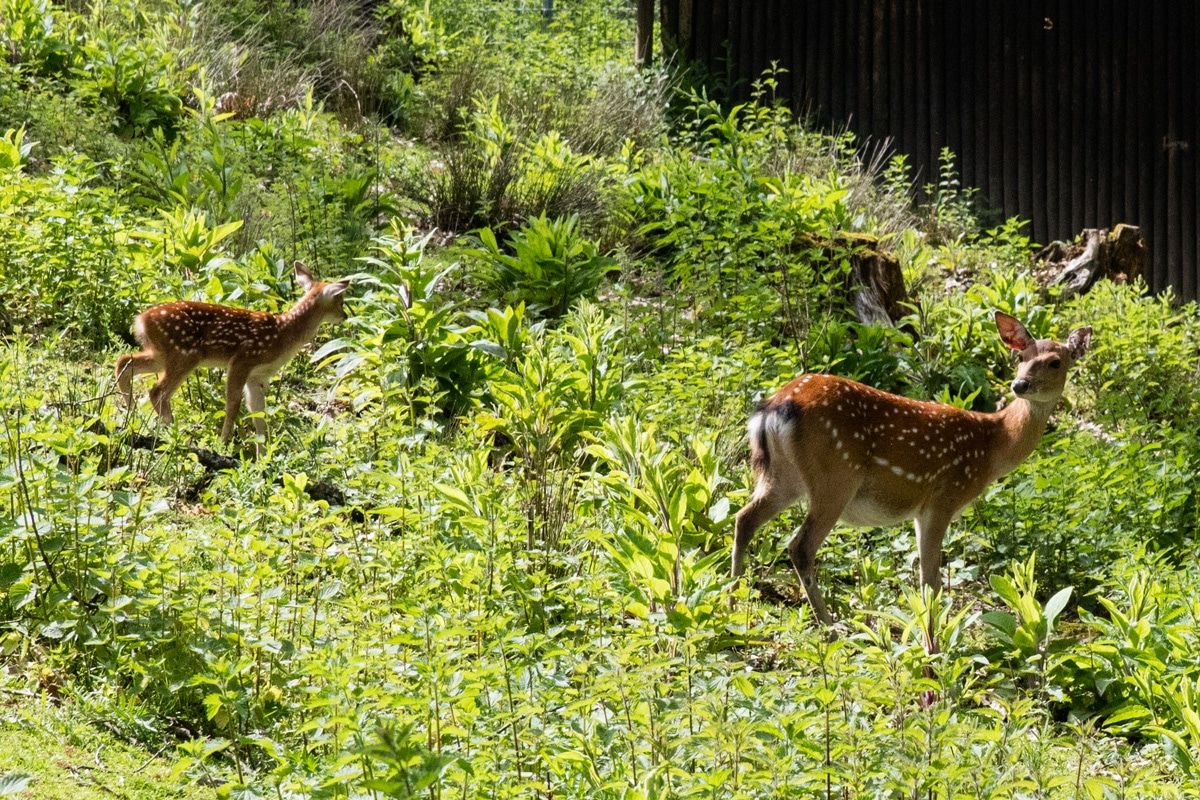 Die Sika-Hirschkuh (rechts) führt ihr Kitz durch das Gehege.