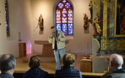 In der Bläsikapelle gab es zusätzliche Erläuterungen von Bernd Reinbold zum kleinen Gotteshaus am Eingang des Kohlenbacher Tal. Zuerst als kleine Kapelle gebaut wurde sie erst 1887 um das Kirchenschiff zur heutigen Größe erweitert. Viele interessante Details gab Reinbold preis wie zu den Votivtafeln, den Figuren und den Fenstern. Das Hauptglasfenster gestaltete kein Geringerer als der bekannte Ulmer Professor und Künstler Wilhelm Geyer, der zudem mit den Geschwister Scholl befreundet war.
