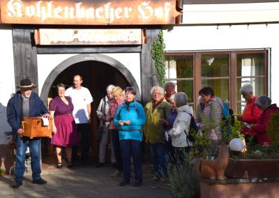 Beim Drehorgelbesitzer Martin Hünerfeld darf bei solch einem Anlass sein eigenes Instrument nicht fehlen. Schließlich sollen bei den Orgelschlemmerwochen alle Register gezogen werden, wie er selbst in seiner Ankündigung für die Wanderfreunde schrieb. Bei einem Zwischenstopp durften alle fleißig die Europa-Hymne mitsingen und am Wanderziel versammelte sich die Gruppe vor dem „Kohlenbacher Hof“ zusammen mit Michaela und Küchenchef Andreas Gluminski, ehe das wohl bekannte Badner Lied erklang.