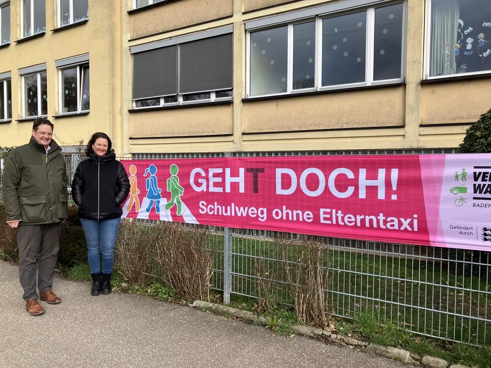 Geh(t) doch! – Schulweg ohne Elterntaxi“: Die Landesverkehrswacht Baden-Württemberg e.V., die Unfallkasse BW sowie das Land Baden-Württemberg setzen sich gegen die steigende Zahl von Elterntaxis ein und haben eine landesweite Spannband-Aktion vor Schulen initiiert
