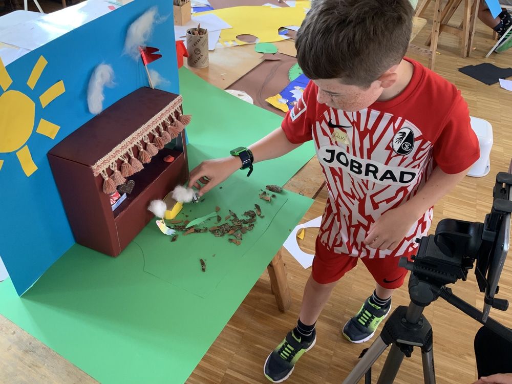 Start war ein gemeinsamer Rundgang durch die Sonderausstellung mit der Leiterin des Museums Angela Witt-Meral und dem Filmemacher Matthias Baumann. Inspiriert von den Bildern entwickelten die Kinder in kleinen Teams aus ihren Ideen eine eigene Geschichte. Um diese umzusetzen, zeichneten sie selbst Figuren, die sie anschließend mit der Bild-für-Bild-Legetechnik zum Leben erweckten.