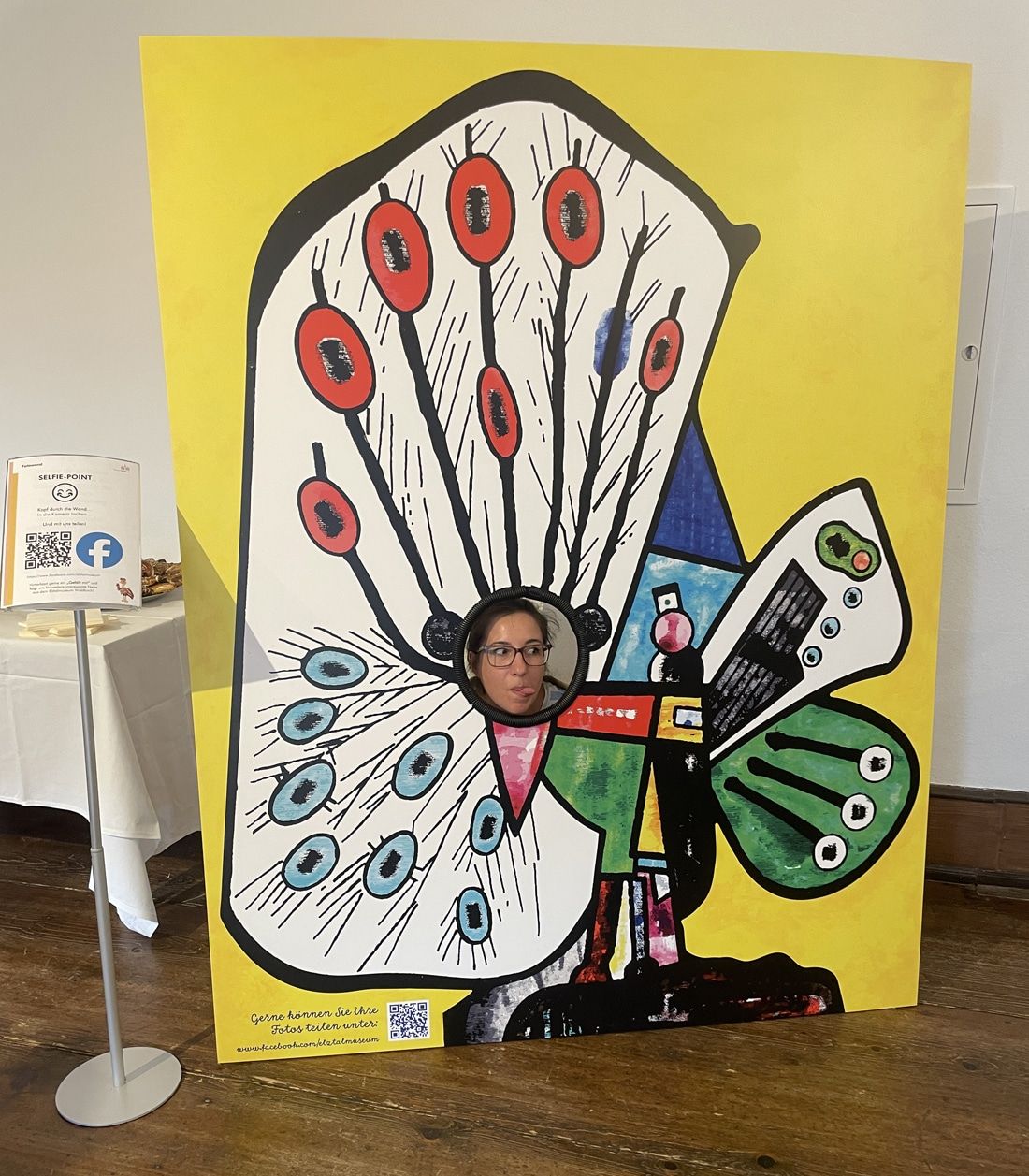 Große und kleine Besucherinnen und Besucher können in der Sonderausstellung im Elztalmuseum beispielsweise in die Rolle des bunten Pfaus schlüpfen – mit Hilfe einer Fotowand zum Durchschauen.