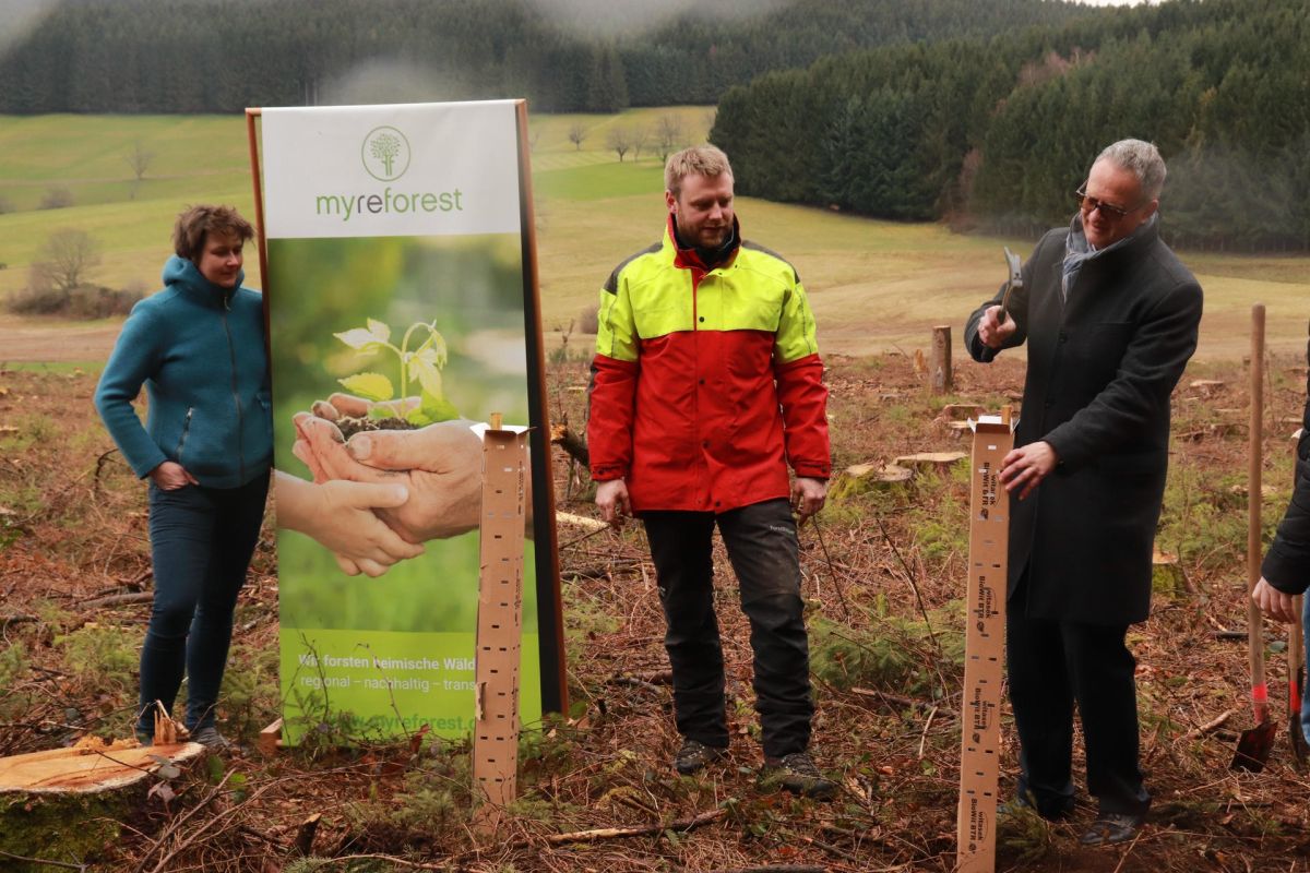 Seit November 2022 besteht eine Kooperation zwischen der gemeinnützigen „myreforest GmbH“, dem zuständigen Forstamt, der Sparkasse Freiburg-Nördl.Brsg. und einem Grundbesitzer in Biederbach. Die ersten 1.000 Bäume werden jetzt gepflanzt, weitere 2.000 Bäume kommen im Herbst auf eine 1 Hektar große, sturmgeschädigte Fläche mit Fichtenwald. Dort wird nun als Gemeinschaftsprojekt ein klimagerechter Mischwald angepflanzt.