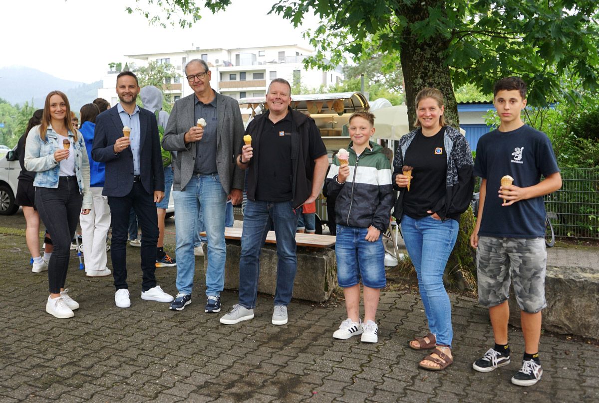 Von der Stadt erhielten die teilnehmenden Schülerinnen und Schüler der beiden besten Schulen, wobei die Radelnden des GSG sage und schreibe 18.224 und der Realschule 13.420 Kilometer zurücklegten, jeweils einen Gutschein für ein Eis. So rollte am letzten Schultag die Bombacher Eismanufaktur auf die beiden Schulhöfe und war dort heiß begehrt.