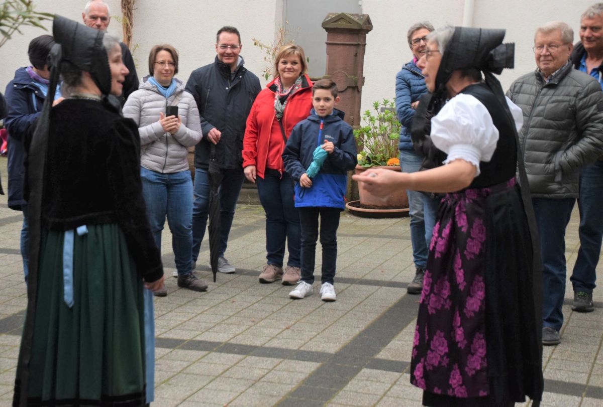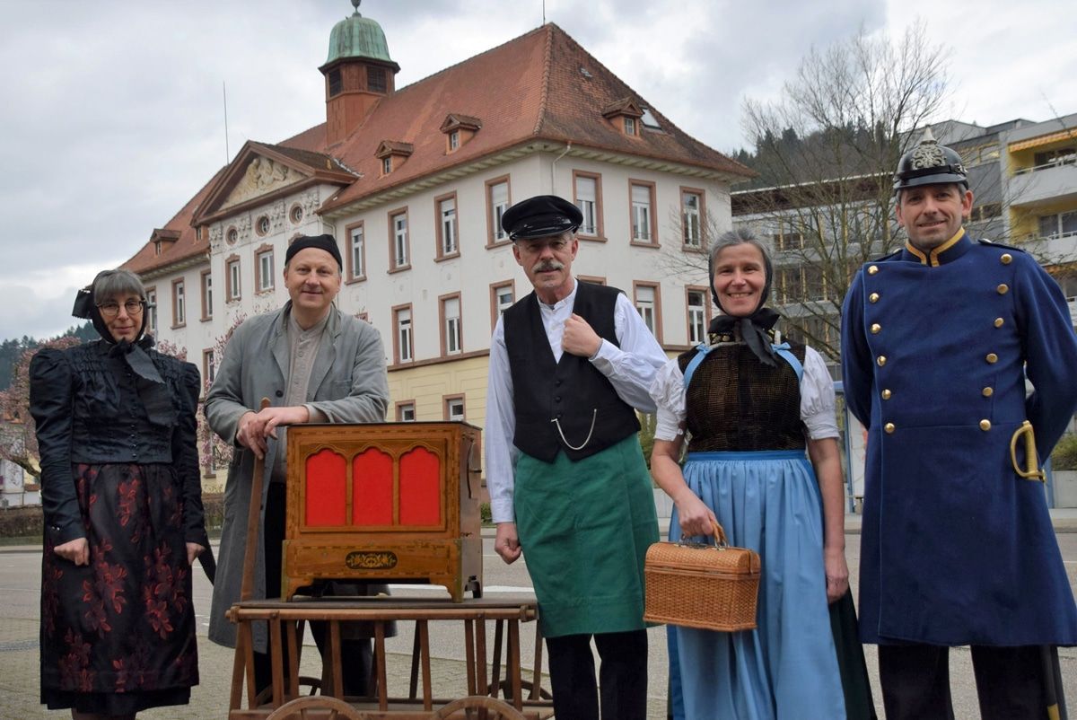 Vor dem damaligen Neubau an der Freiburger Straße (heute Altbau von St. Nikolai) die Gruppe um Theres, die für eine spannende, amüsante und abwechslungsreiche Führung sorgen: (von links) die Spital-Marie (Monika Heizmann), der Hausknecht Gustav (Thomas Kern), die Hausmagd Theres (Barbara Kern), der Polizeidiener Xaver (Roland Wehrle) und schließlich der Orgel-Franz (Bernd Wintermantel).
