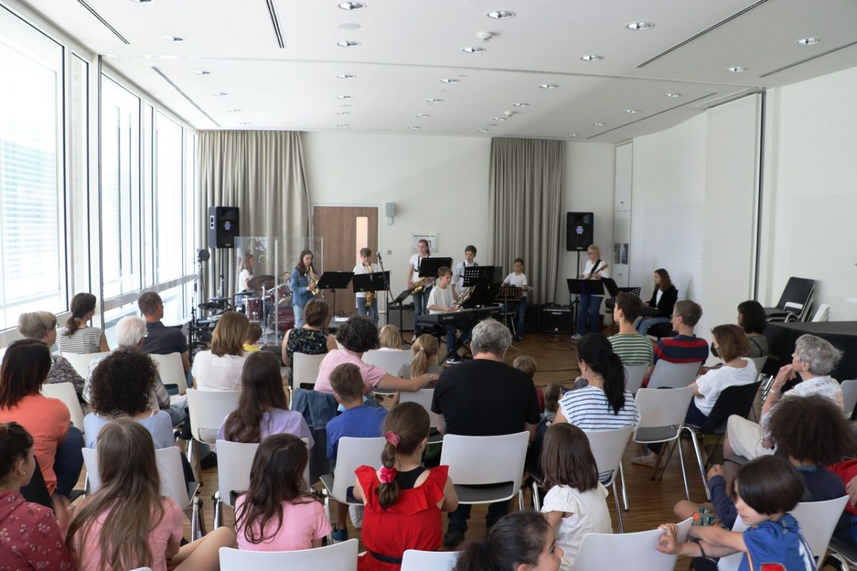 Im großen Saal der Musikschule setzte sich das Fest klangvoll fort – auch hier spiegelte sich die Vielfalt der Möglichkeiten, die Schüler und Schülerinnen bei der Auswahl an Instrumenten und Ensembles haben, wider: vom klassischen Zusammenklang im Kinderkammerorchester, über Flöten- oder Akkordeonensembles bis hin zu Bands verschiedener Ausrichtung wie Pop, Rock oder Jazz traten dort auf und begeisterten die Zuhörenden. Spannend waren die öffentlichen Proben, bei denen erlebt werden konnte, wie Stücke eingeübt und gemeinsam mit dem Lehrer oder der Lehrerin am Auftritt gefeilt wurden.
