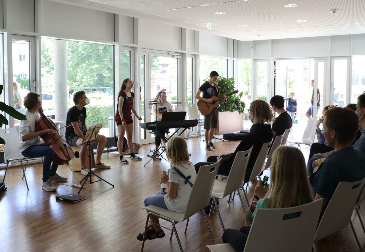 Viele Interessierte und Gäste kamen zum Fest der Städtischen Musikschule. Bereits vor dem Gisela Sick Bildungshaus wehten die ersten Melodien aus den geöffneten Fenstern des „Raums der Ruhe“ in den grünen Außenbereich herüber. Dies genossen einige bei Kuchen und Kaffee, viele ließen sich aber auch die Gelegenheit nicht entgehen, die jungen Musiker und Musikerinnen hautnah zu erleben